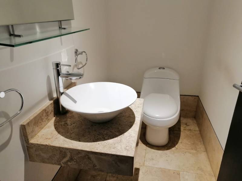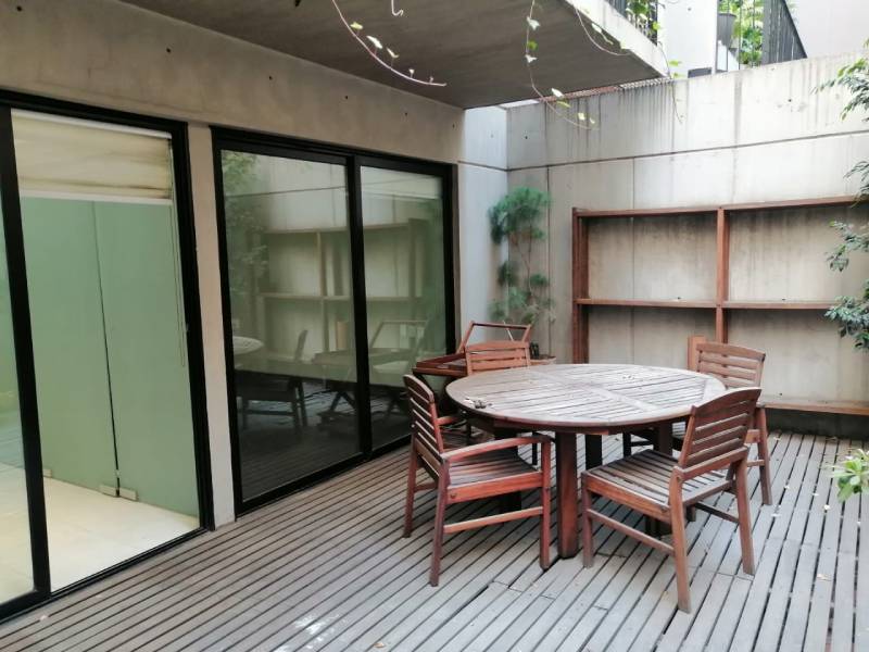 92 m2 de departamento + 32 m2 de terraza, 1 recámara, 1.5 baños y 1 lugar de estacionamiento, cuenta con refrigerador.